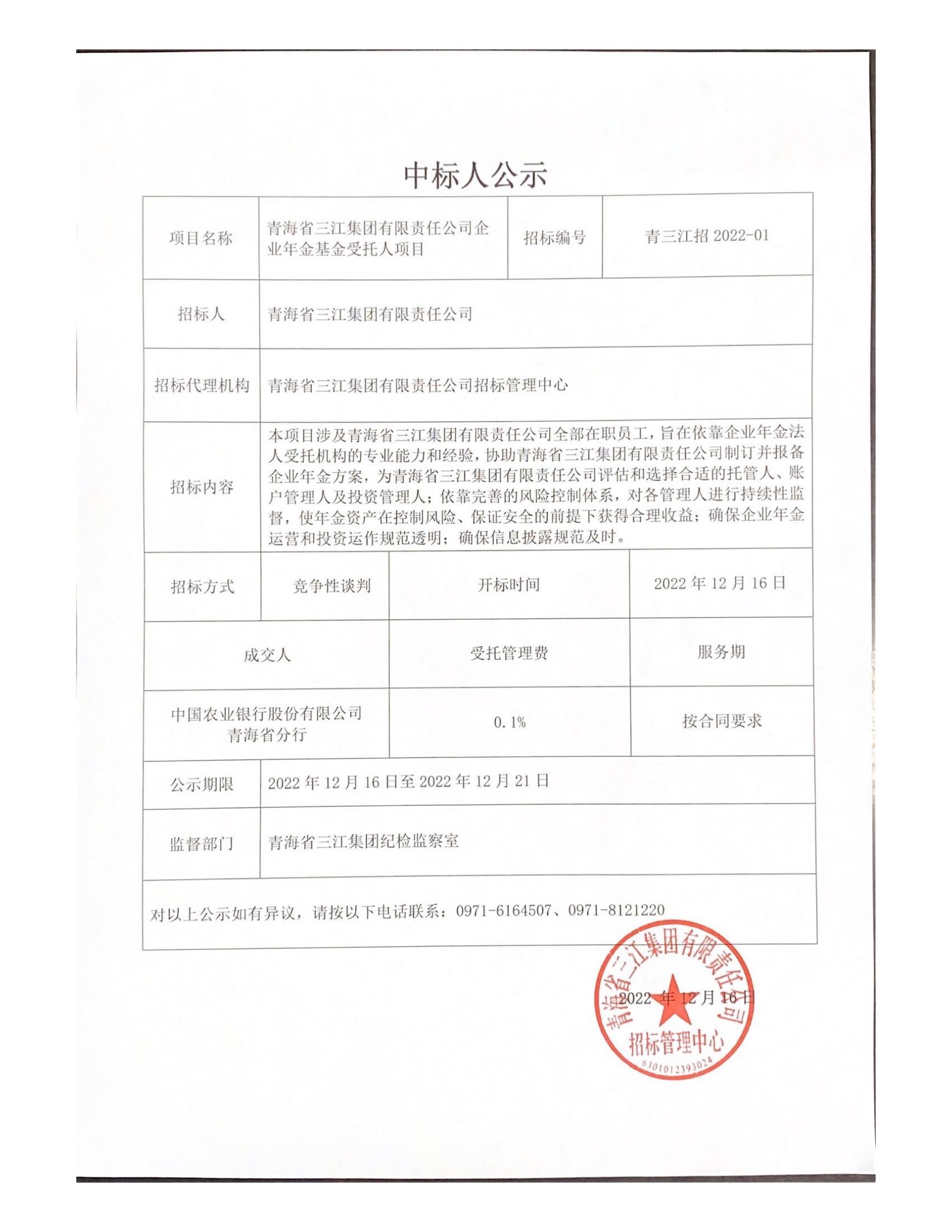 青海省三江集团有限责任公司企业年金基金受托人项目中标人公示