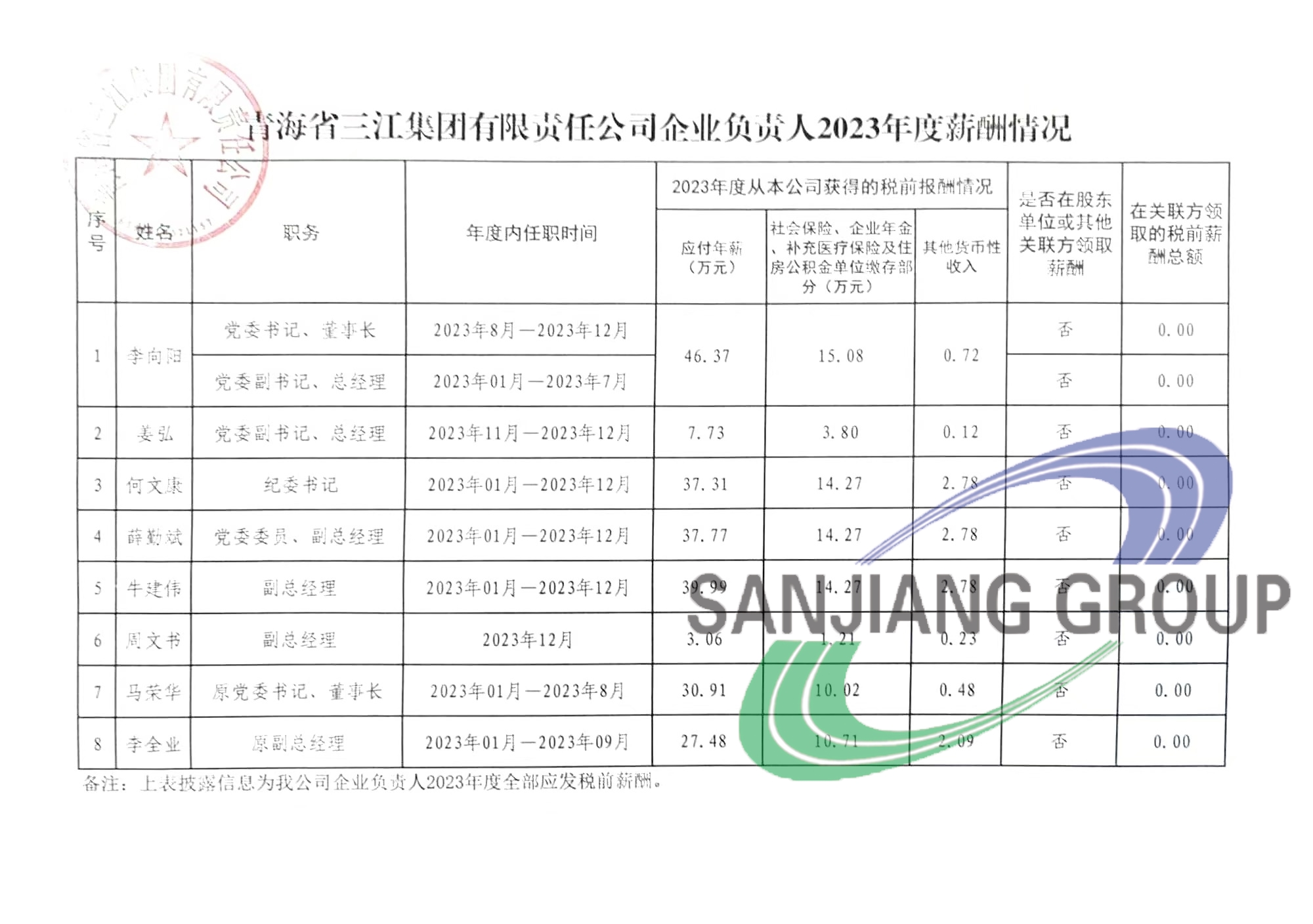 青海省三江集团有限责任公司企业负责人2023年度薪酬情况