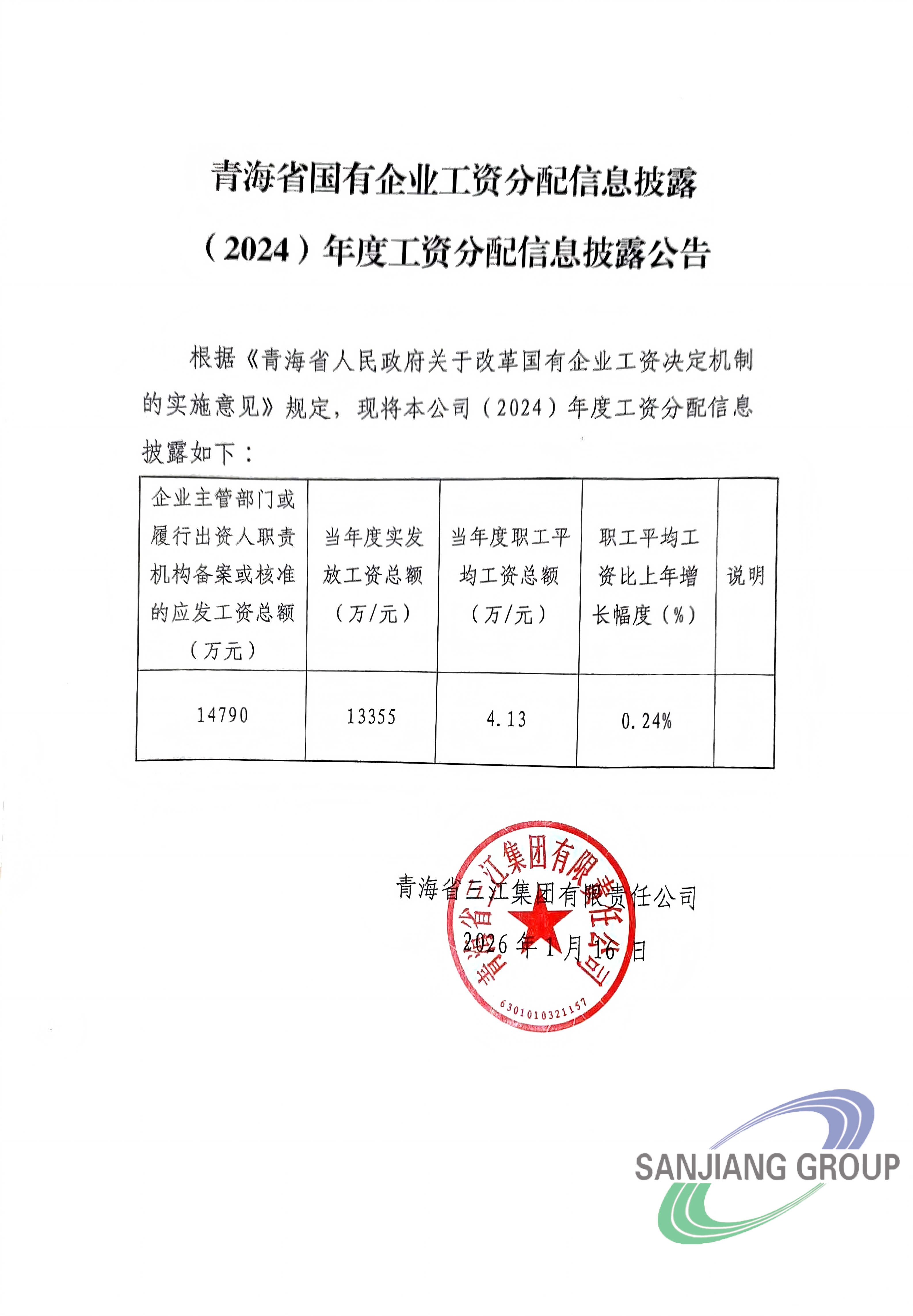 青海省国有企业工资分配信息披露 (2024)年度工资分配信息披露公告
